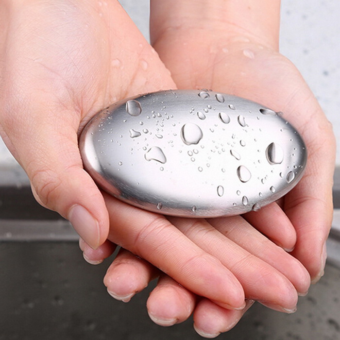 Раньше приходилось постоянно ломать голову над тем, чем вывести неприятные запахи, но теперь для этого можно использовать металлическое мыло. Отполированный бесшовный брусочек из нержавейки весит меньше 100 грамм, да и пользоваться им проще простого: мытье рук ничем не отличается от процедуры с привычным туалетным мылом.