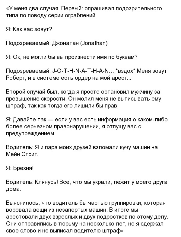 Один из пользователей социальной сети создал ветку обсуждения, в которой попросил полицейских рассказать истории из своей практики, когда люди что-то "ляпнули" на нервах, а лишь только потом сообразили, что этого не стоило говорить при полиции. Ответы не заставили себя долго ждать, а к обсуждению присоединились и обычные люди, которые попадали в подобные истории.