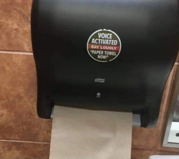 Надпись: «Голосовое управление. Скажите громко: „Бумажное полотенце сейчас же!“»
