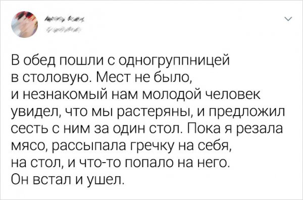У всех нас есть история, которую очень хочется рассказать, но... стыдно. Специально для таких случаев в Твиттере регулярно проводится флешмоб под названием "Моя стыдная история". В нем пользователи могут без доли стеснения поведать о своих досадных неудачах. Давайте посмотрим.