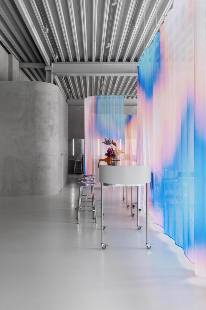 В бьюти-коворкинге Sfera спроектированы 7 косметических кабинетов, 6 парикмахерских мест и 4 маникюрных стола, а также стойка регистрации и небольшой лекционный зал. Все функциональные зоны разделены занавесками. Помещение изначально имело высокие потолки и большие окна, поэтому архитектор хотел сохранить хорошую освещённость и сделать пространство ярким. В интерьере доминирует светло-серый цвет, а единственным красочным акцентом стали шторы — ключевой элемент интерьера визуально и функционально. Принт был создан совместно с основательницей бренда Laroque Катей Пятицкой и вдохновлён тепловыми картами, а палитра соответствует фирменному стилю Sfera.