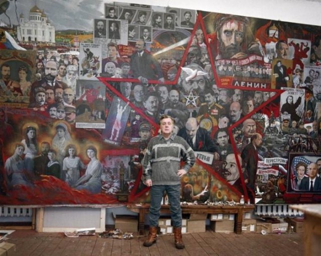 Художник Илья Глазунов на фоне своей картины «Великий эксперимент», 1990 год, Москва
