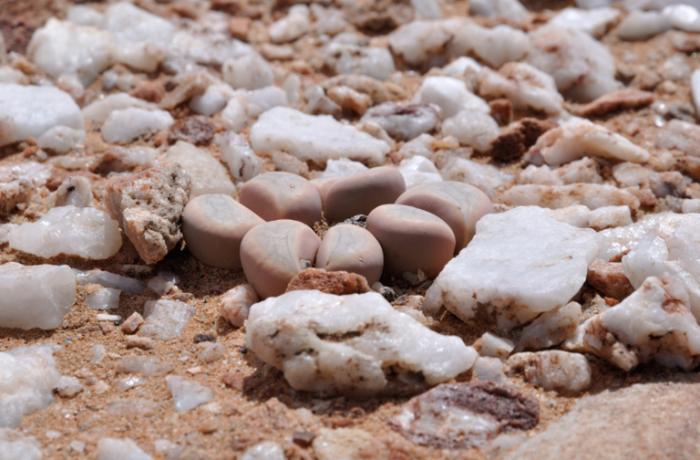 Находясь в туре по пустыне, не удивляйтесь, обнаружив камень, который не двигается с места, когда его пнешь. Литопсы очень легко перепутать с галькой, но только до тех пор, пока не появятся бутоны. Неслучайно растения так и называют: «живые камни». Встречаются литопсы в каменистых пустынях Южной и Юго-Западной Африки, где другие растения выжить не могут. Известно около 40 видов этого рода, и все обитают под землей. На поверхности остается лишь кончик булавовидного листа, размер которого в зависимости от вида может достигать до 5 см в высоту и ширину. Когда приходит время появиться новым листьям, старые отмирают, отдавая питательные вещества и влагу молодой паре. А после дождей, которые обычно приходятся на осень, по всей пустыне, как по команде, раскрываются миллионы желтых, белых или оранжевых небольших цветов. Они опыляются, созревает плод, ветер рассеивает семена, и литопсы снова уходят в состояние покоя.
