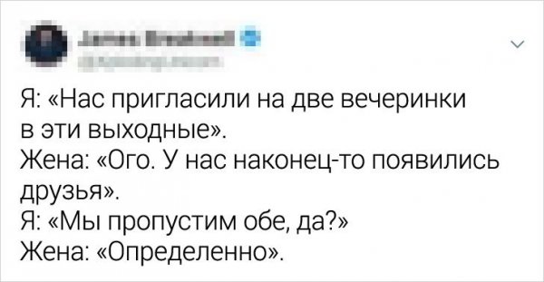 Период медового месяца и семейной благодати обычно длится недолго. На смену радости приходит зловещий "быт". Поэтому молодой семейной паре нужно пройти экзамен на прочность. А чтобы успешно пройти этот тест, нельзя забывать о чувстве юмора, который поддержит в трудный час. Давайте посмотрим забавные твиты о семейной жизни.