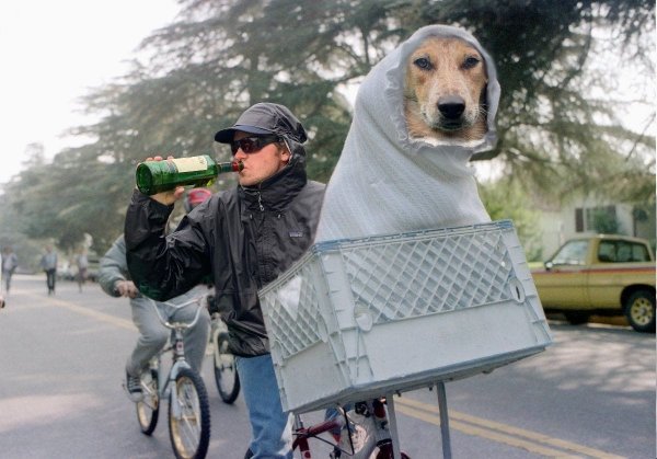 Фотография с собакой в куртке и пьющими рыбаками (13 фото)