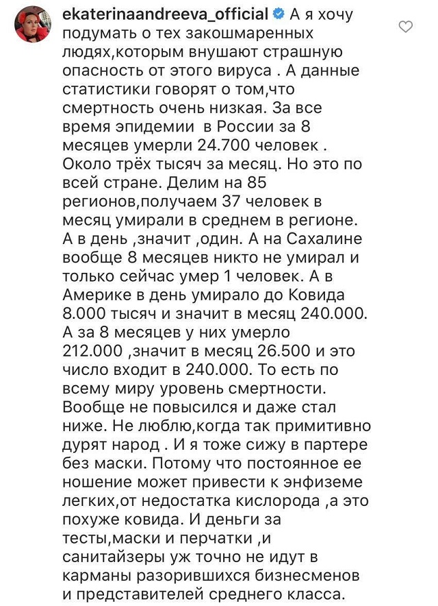 Но призыв Яновского совсем не впечатлил Екатерину Андрееву. Она написала развернутый комментарий о "закошмаренных людях", которых запугали ложной информацией о коронавирусе.